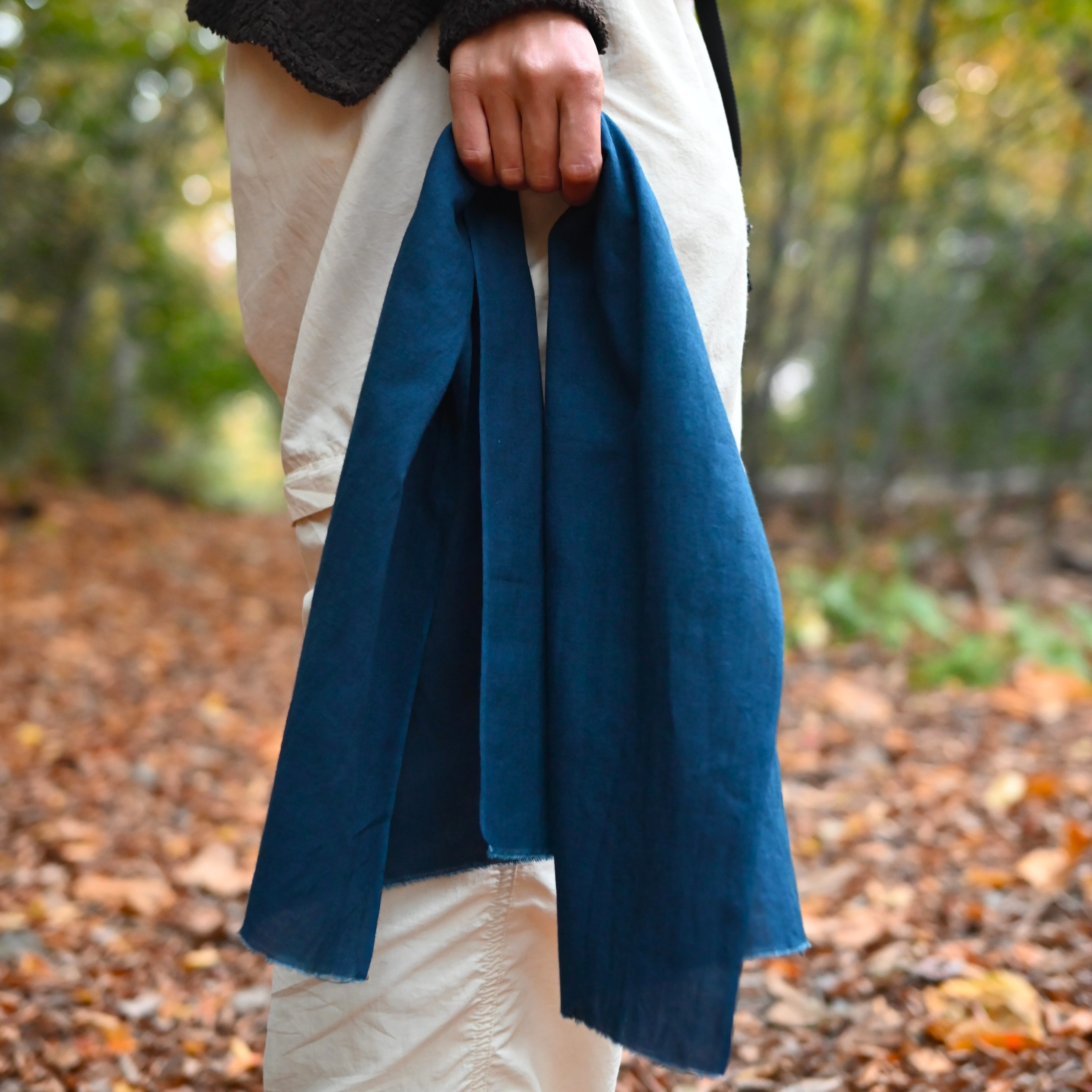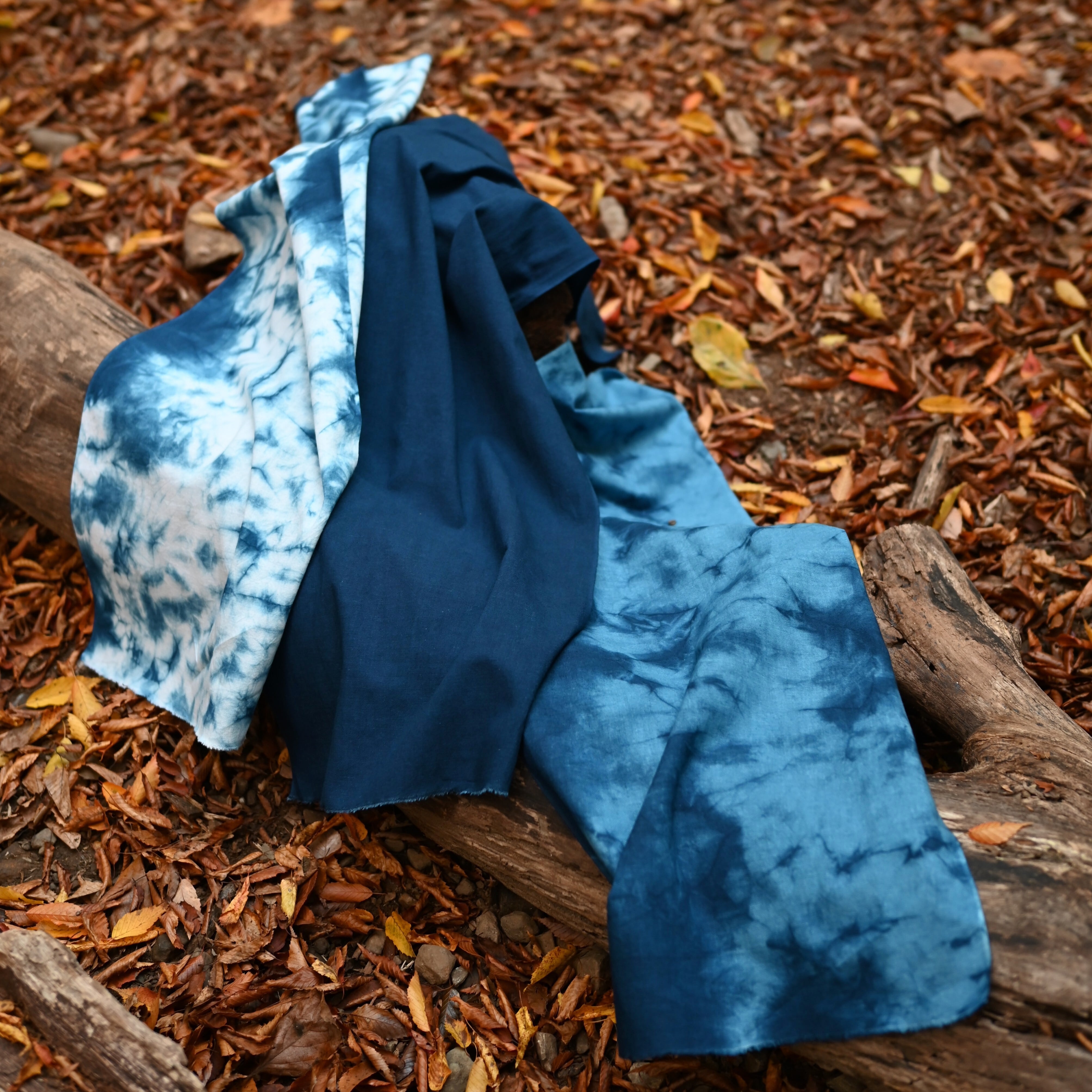 京都で藍染の原料となる藍の栽培から蒅造り、染色、制作したomomukiの種々布(しゅじゅふ)。