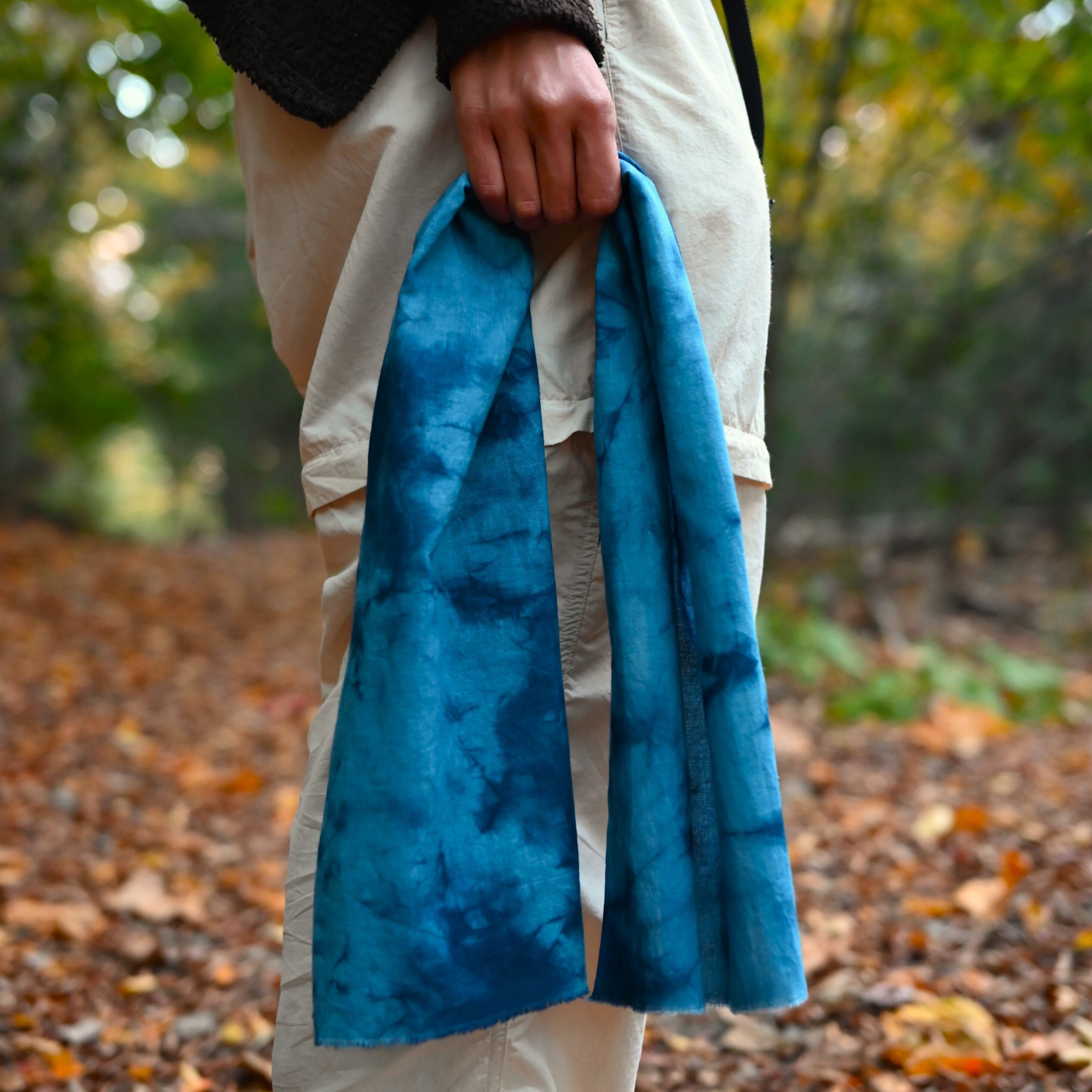 京都で藍染の原料となる藍の栽培から蒅造り、染色、制作したomomukiの種々布(しゅじゅふ)。